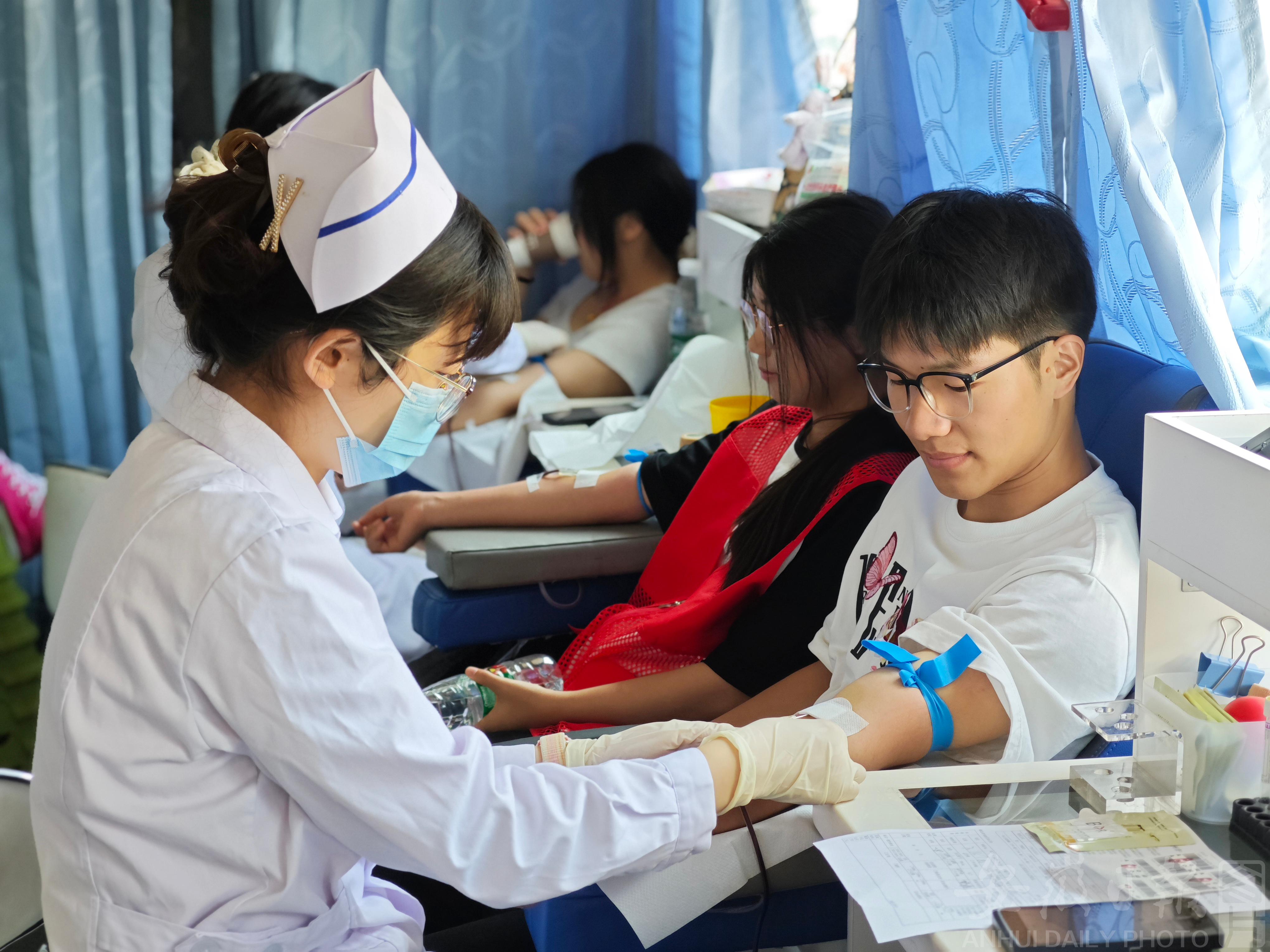 6月18日,滁州市南谯区腰铺镇梅铺社区党员、居民群众等踊跃开展“无偿献血奉献爱心”志愿服务活动,来自各行各业的志愿者们踊跃参加无偿献血,用实际行动奉献自己的爱心,为“生命”加油。 (通讯员 董超 季凤 摄)