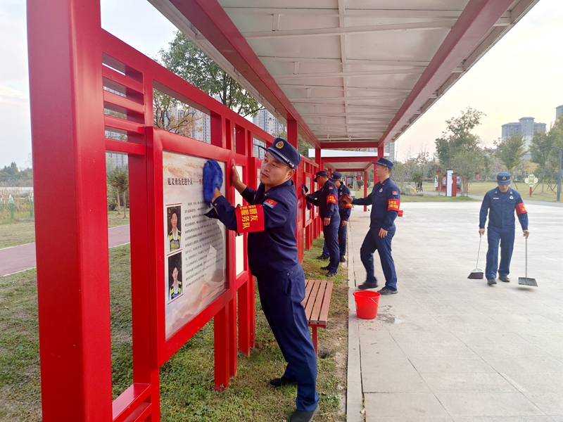 图为擦洗宣传栏。