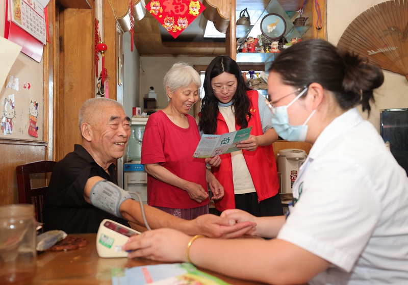 7月22日,相山区西街道新华社区家庭签约医生为社区老年人测量血压,解答居民用药问题。