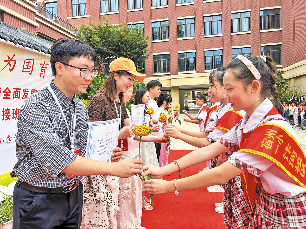 9月10日,宿州市第一小学学生向老师献花。当日是第40个教师节,我市各中小学纷纷举办各类主题活动,向老师们致以崇高敬意和节日祝福。(拂晓报 记者 蒋帮煜 摄)