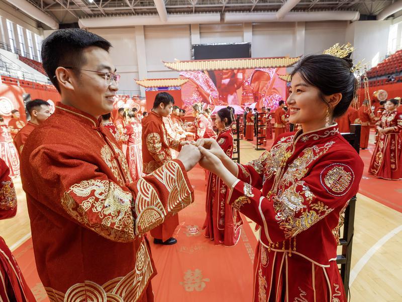 9月22日,在宿州学院体育馆,新人们通过视频连线,参加由全国妇联、国家民委、民政部等部门联合主办的“家国同庆 见证幸福”2024年全国万人集体婚礼。在这场简约而又浪漫的集体婚礼上,宿州100对新人共同许下爱的誓约,以爱的名义,庆祝新中国75周年华诞。(拂晓报 记者 马峰 苏洋 摄)