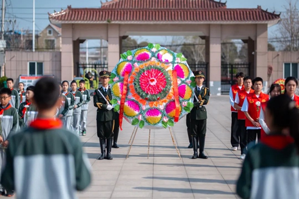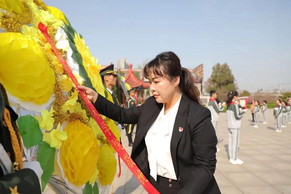 向烈士敬献花圈;整理挽联;安阳职业技术学院和银杏小学分别向革命英雄纪念碑敬献花圈,代队老师上前整理挽联,深切缅怀革命先烈。