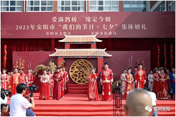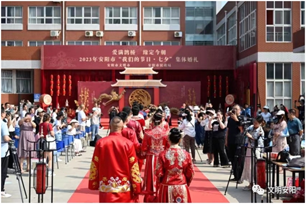 8月21日,安阳市首届爱满鹊桥缘定今朝“我们的节日·七夕”集体婚礼在市妇女儿童活动中心举行。本次活动以倡导移风易俗,共树文明节俭、健康向上婚恋新风尚为主题。