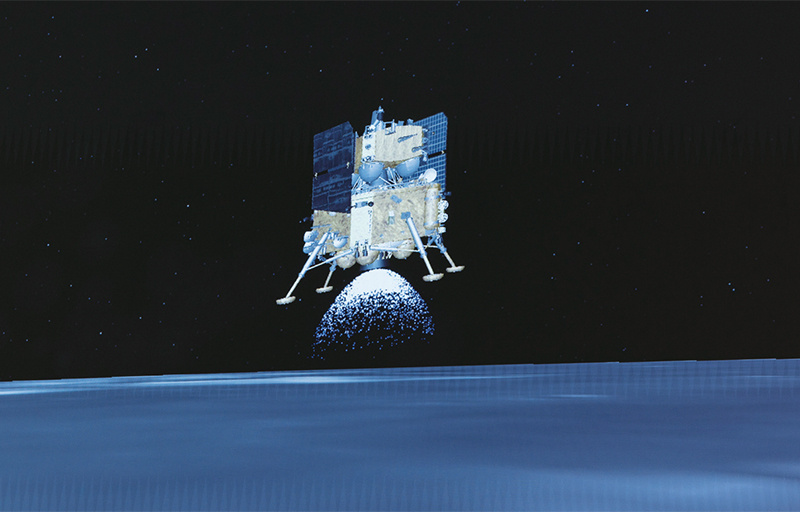 2024年6月2日清晨,嫦娥六号成功着陆在月球背面南极—艾特肯盆地预选着陆区,开启人类探测器首次在月球背面实施的样品采集任务。图为2024年6月2日,在北京航天飞行控制中心屏幕上拍摄的嫦娥六号着陆器和上升器组合体着陆月背的模拟动画画面。新华社记者 金立旺 摄