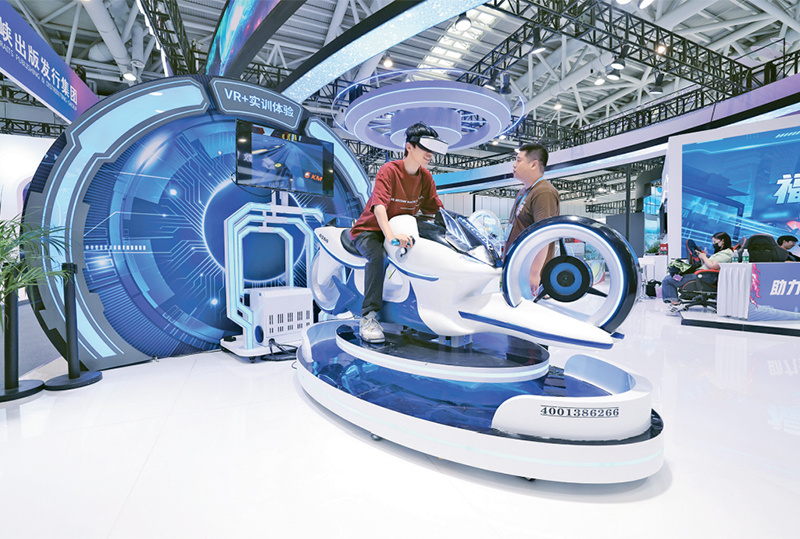 第七届数字中国建设峰会于2024年5月24日在福建省福州市开幕,峰会主题为“释放数据要素价值,发展新质生产力”。图为市民在峰会现场体验区网龙展区体验光速飞轮VR摩托竞速项目。中新社发 王旺旺 摄