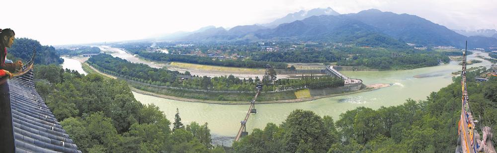 秦堰楼上俯瞰都江堰水利工程和安澜索桥