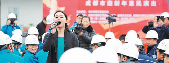 “再来一个!再来一个!”“那我就走到你们中间来唱嘛,好不好!”1月15日下午2时许,室外寒气逼人,但是成都天回镇新凤凰大道的工地上,却是暖流涌动。东方茉莉女子国乐团团长、国家一级演员马渲子奉献的歌曲《快乐分享》(成都文艺志愿者之歌)《你是好人》,赢得了工友们真诚的欢呼与掌声。当她走进工友中间纵情高歌,现场气氛更加高涨,一位工友还主动请缨,与马渲子合作演唱了一曲《你最珍贵》,马渲子鼓励的手势、温暖的眼神,让这位工友信心倍增,“工地好声音”掀起现场阵阵热浪。