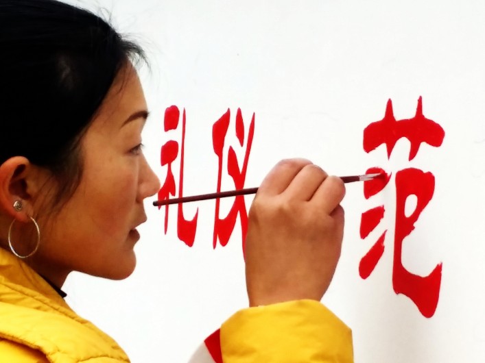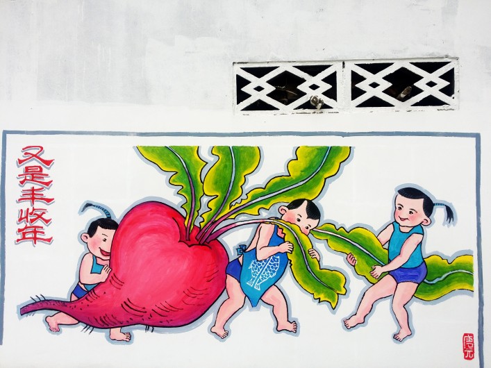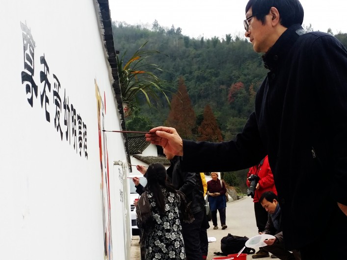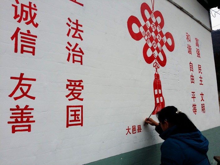 村民们在墙上创作社会主义核心价值观主题的手绘作品