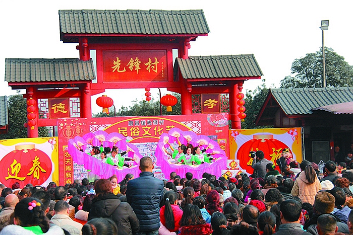 扭秧歌、打腰鼓、耍龙灯……正月初一,郫县唐昌镇先锋村首届民俗beplay官网app 节在先锋村广场举行,乡情乡音的文艺表演、扎糖人等传统活动吸引上万人参与。