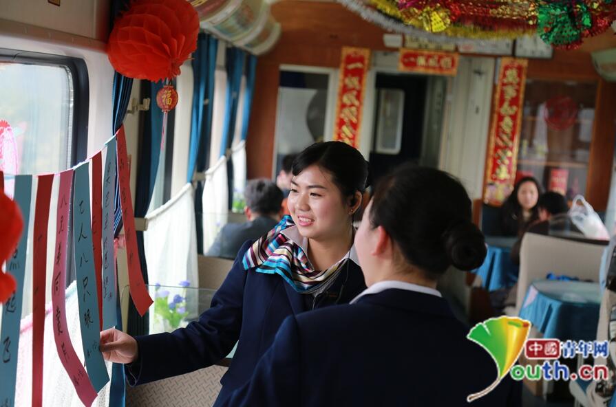 乘务员用灯谜装扮车厢,列车上洋溢着温馨的气氛。