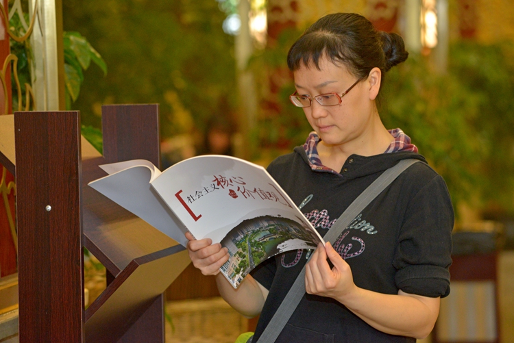 市民在茶馆里阅读核心价值观刊物