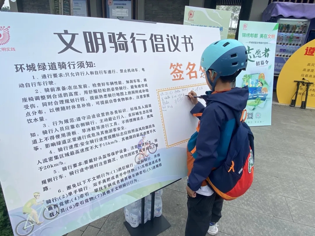 在绕城绿道上,“向劳动者致敬,约你一起安全文明骑行”——锦江区环城绿道安全文明出行宣传倡导活动火热进行中。50余名骑行代表签下“文明骑行公约”,倡导安全文明骑行,并就地成为志愿者,在前胸或后背张贴醒目的安全文明提示标语,成为文明骑行的“践行者和劝导员”。