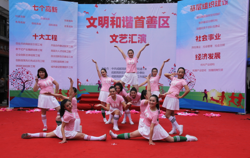 文艺汇演由肖家河机关单位、学校、公安、居民团体编排的精品节目组成,有肖家河辖区合唱团《壮士出川》、西藏中学表演的藏族舞《雪山之子》、街道工作人员的舞蹈《夏曼古丽》、公安情景诗朗诵《请人民放心》,以及吉他演奏和时装秀等,居民们不时发出欢快的欢呼声。