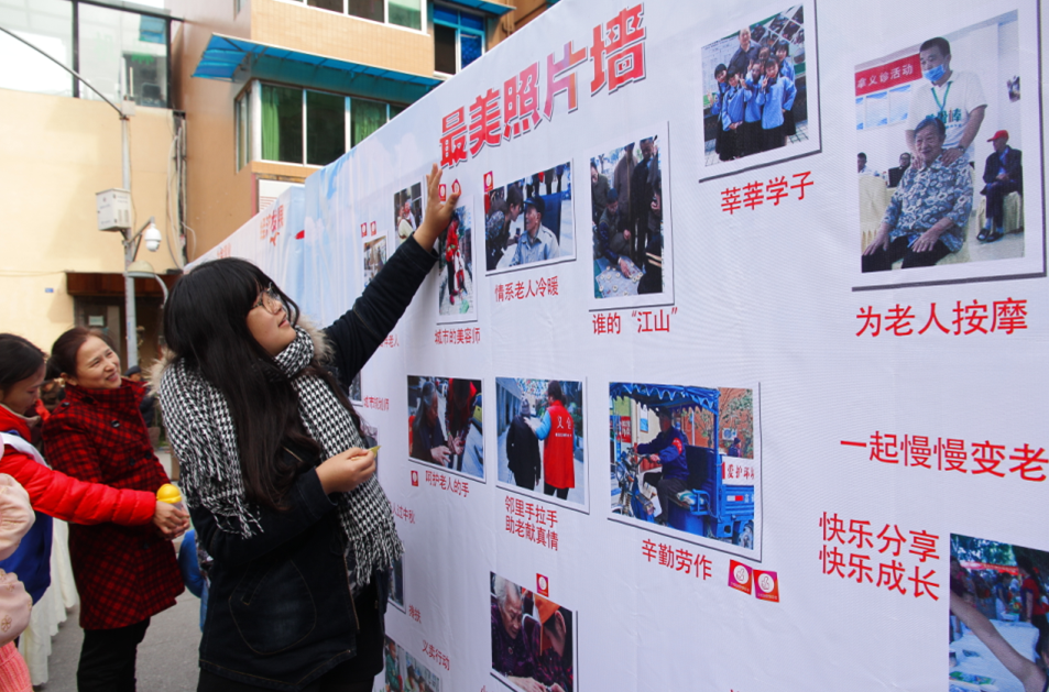 最美照片墙是由社区居民提供的感人照片组成,现场居民积极参与,为感动自己的照片点赞。