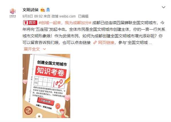 “成都已经连续四届蝉联全国文明城市,今年将向“五连冠发起冲击。全体市民是全国文明城市创建主体,你的一言一行关系城市文明形象哦!作为武侯市民,如何为成都创建全国文明城市增光添彩呢?”近日,“文明武侯”新浪微博发起“创城一起来,我为成都加分”话题讨论,邀请网友留言分享,如何参与成都创建第六届全国文明城市。话题发起后,网友积极参与并分享自己参与成都创建全国文明城市创建的点点滴滴。