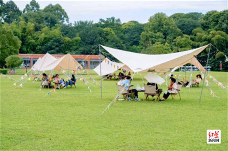 秋风起,空气中的凉爽与闲适满是治愈的气息。大草坪上零星点缀着帐篷,游客们品清茶、尝甜点、展笑语,享受露营带来的惬意。