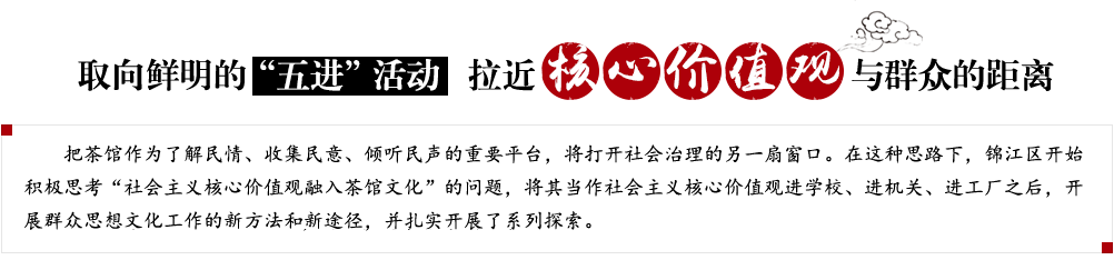 翠柳居茶楼依托群众茶馆beplay官网app 阵地建设,通过“锦江讲坛”这一beplay官网app 交流活动品牌,茶楼组织了多项主题学术沙龙,传递爱国、敬业、诚信、友善等思想意识,进一步涵育文明新风,推进社会主义核心价值观建设在锦江落到实处。[详情]