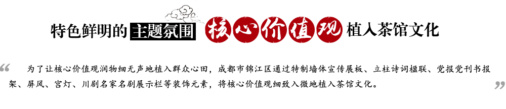 悦来茶园,位于春熙路市中心,主要受众是具有传统beplay官网app 情结的川剧票友、外地来蓉商旅。茶馆通过川剧表演歌忠伐奸、颂美贬丑、倡孝鞭逆、宣真惩假、扬诚诋鄙等等,潜移默化地传递爱国、文明、和谐等核心价值观主旋律。[详情]