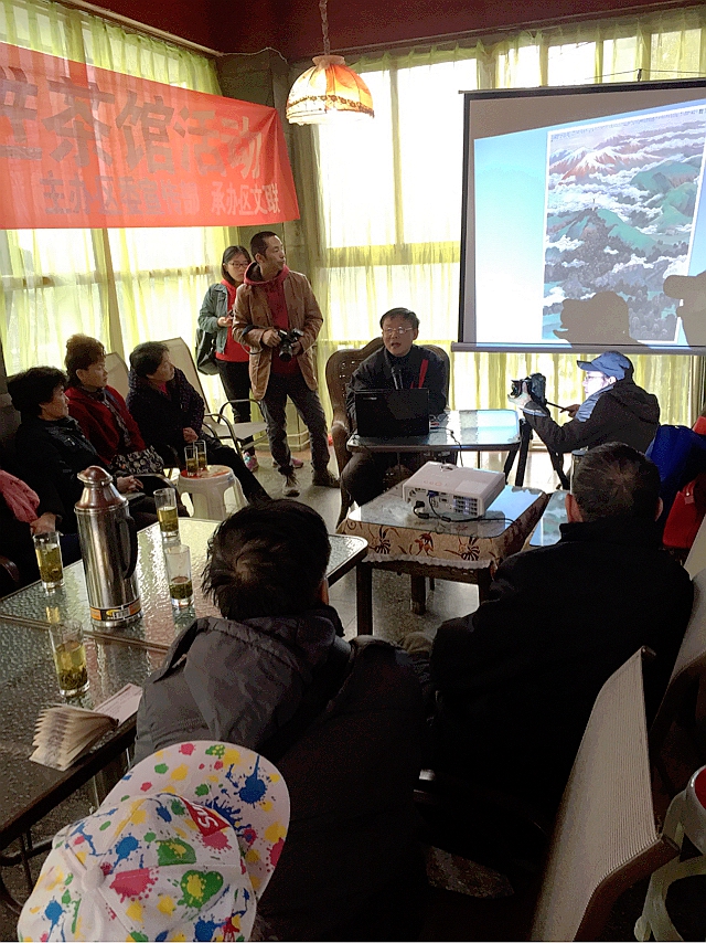 大家各自端上一碗茶,活动也正式开始了。听者围桌而坐,四川师范大学艺术学院教授、硕士研究生导师程峰以“国画技法讲解”为主题进行了讲授。