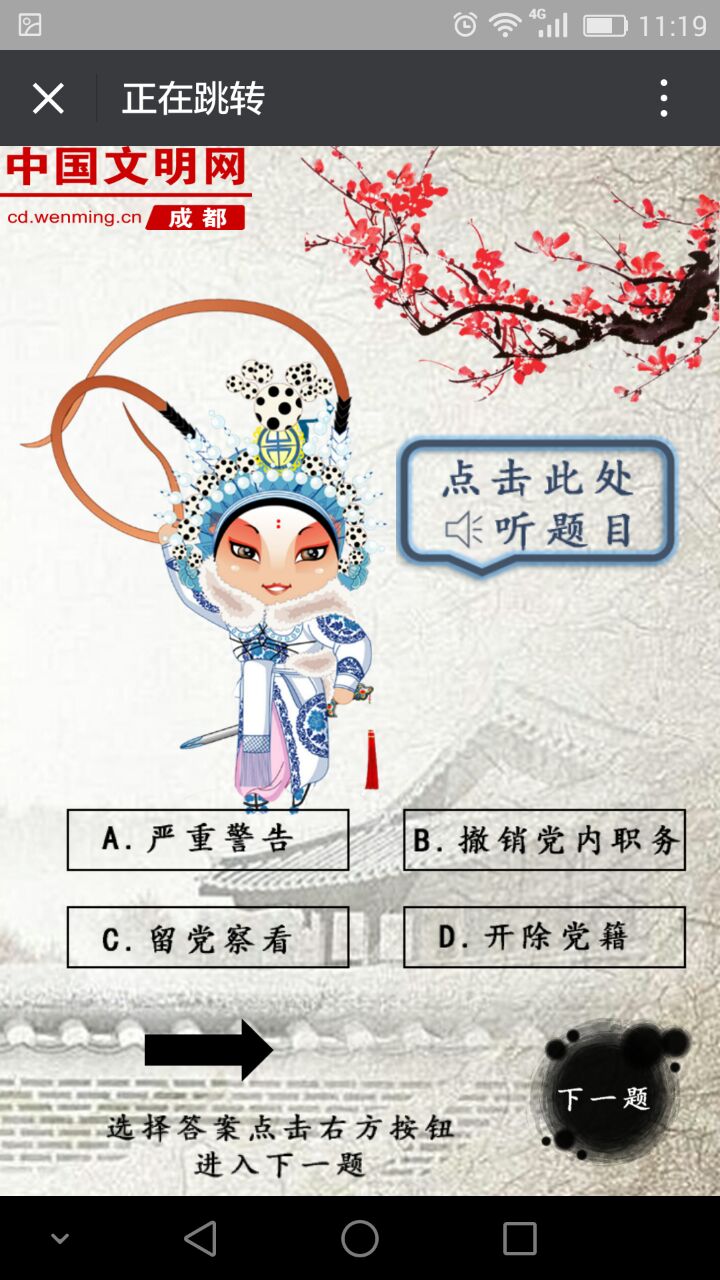 “哈哈哈,你是一名资深党员”,根据“两学一做”内容,创新开发的“两学一做”知识听答竞赛网络小游戏,区别于传统看字答题的方式,“先声夺人”,借助语音提问,同时根据答题得分,划分“资深党员”、“普通党员”、“预备党员”、“普通群众”等几种身份,吸引众网友关注。游戏设计上还融入成都独有的戏剧画风,将川剧人物动态化,充分突出游戏的趣味性,让严肃的“两学一做”内容变得萌萌哒,激发更多人学习党章党规和习总书记系列讲话精神等重要内容。