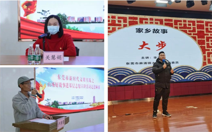 大步村宣传委员李志昌以《家乡——桑梓之地 父母之邦》为题,讲述大步村从水乡农村到如今“香飘四季”美丽乡村的蝶变;镇社卫中心医师关慧娟以《不忘初心 抗疫前行》为题,通过大众化通俗化语言讲述了亲身经历的抗疫故事;麻涌环保志愿者、民间河长卢沛荣以《爱的感悟》为题,讲述了自身大病过后投身公益活动,竭尽全力守护河涌的环保故事。