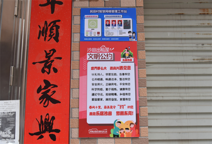 在沙田民田村示范网格,有着130栋“宽管型”出租屋,沙田镇新时代文明实践中心、网格管理中心、民田村工作人员组成宣传小组,向房东讲解东莞出租屋文明共享计划、“智网工程”示范网格、平安出租屋等政策,并在出租屋显眼处粘贴沙田出租屋文明公约、东莞文明有礼十八条、智慧网格工作站联系卡,让广大租户可以通过联系卡找到身边的网格员,同时通过租户文明公约的约定和文明氛围的提升,进一步约定租住文明行为,提升广大租户广泛参与城市共建共享工作,助推出租屋争创平安出租屋,变身“文明屋”,营造文明宣传、网格管理服务全覆盖氛围。