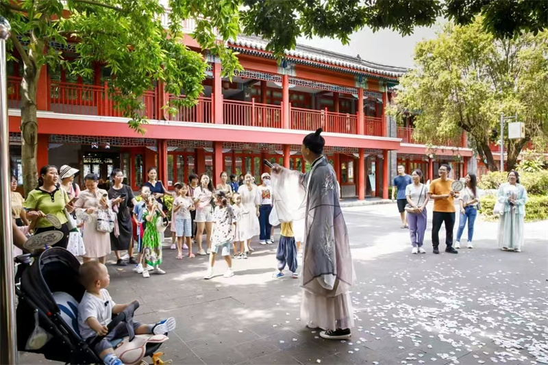 “诗语乞巧”快闪环节中,演员以古代诗人的造型与市民互动,进行了精彩的诗词吟诵表演,仿佛带领大家穿越回到古代诗意盎然的乞巧佳节。