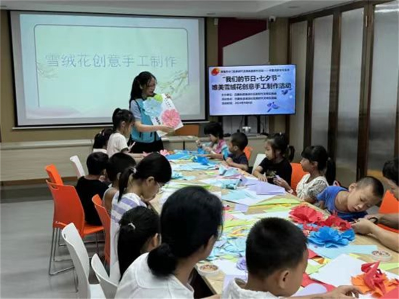 8月6日下午,白藤街道湖滨社区新时代文明实践站组织辖区儿童开展“我们的节日·七夕节”唯美雪绒花创意手工制作活动。