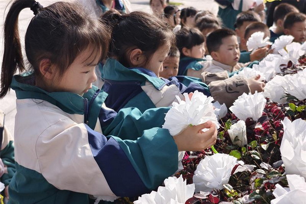 活动当天,学生们排着整齐的队伍来到烈士墓碑前,全体肃立,奏唱国歌并默哀,校领导号召大家不忘革命先烈遗志,心怀感恩,不懈努力,为实现中华民族伟大复兴的中国梦而奋斗。少先队学生代表表示,一定不辜负烈士遗愿,踏着烈士们的足迹奋勇向前!随后,全体师生依次将菊花摆放在烈士墓前,大家用最传统的方式向烈士们表达崇高的敬意和哀思。