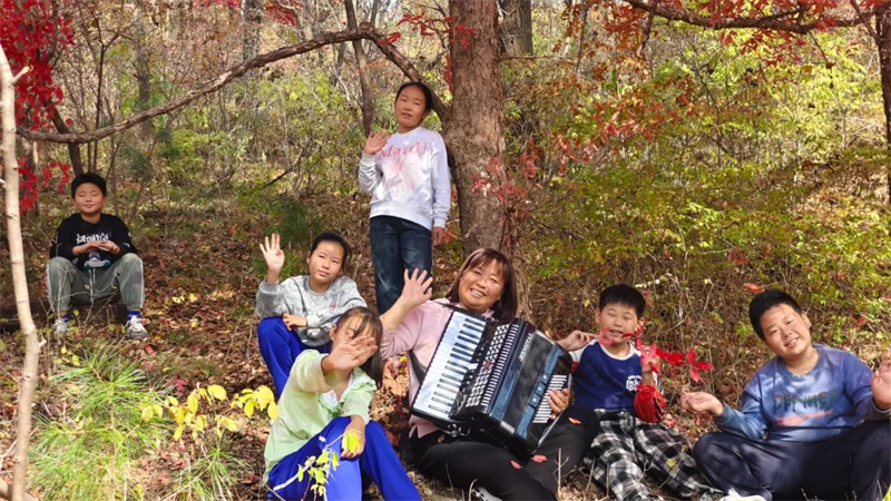 张冬(右三)带孩子们在山林里一边感受大自然的美好,一边学习音乐。吉林省文明办供图