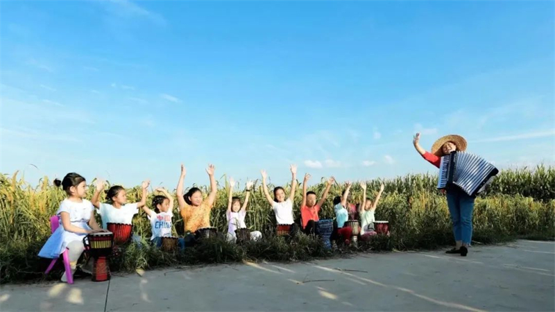 张冬带学生在田野里学习音乐。吉林省文明办供图