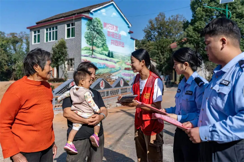 余巧(右三)与辅警一起给村民普及安全知识。湖北省文明办供图