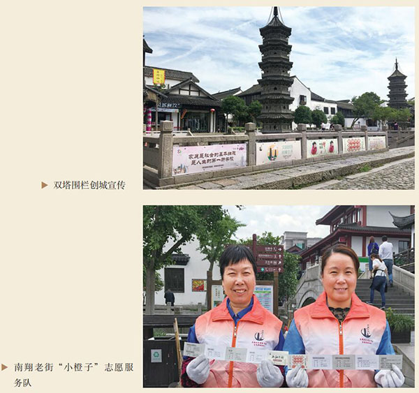 (一)打造一个志愿服务品牌。2020年,南翔老街景区积极响应南翔镇新时代文明实践分中心的建设工作,以由151名志愿者组成的“小橙子”志愿服务队作为南翔老街志愿服务品牌,负责包干包点商业大街、景区景点、宾馆饭店、爱国主义教育基地等点位,同时,为开展“红色乐语”“古韵修身”“老街心力量”等6类志愿服务提供保障。