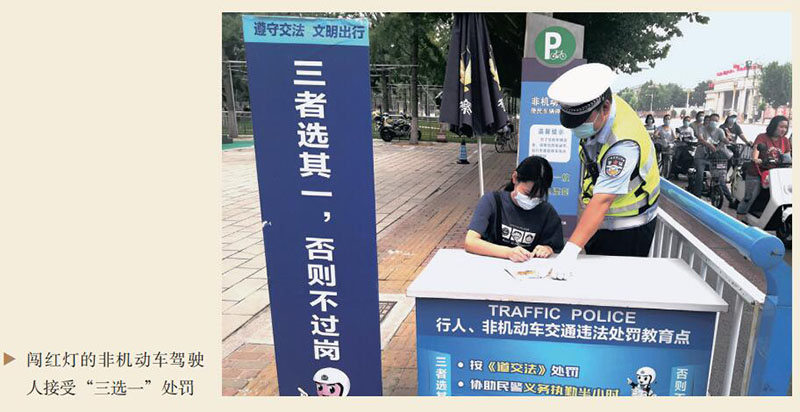 坚持严管严控,制定出台重点举措和最严交规“双20条”,完善处罚机制和技术手段,坚持学罚结合,提高交通参与者守法意识。一是“人脸识别”显神通。从2018年6月开始,公安交管部门积极推动“人脸识别”系统推广应用,实现了对行人闯红灯交通违法行为的自动抓拍,对于违法事实成立的本市人员进行处罚。同时将违法行为在路口大屏滚动播放,予以曝光。目前,共曝光违规人员444人次,处罚275人次。二是“三选一”方能过岗。对行人和非机动车违法行为亮出“三招”。“第一招”接受现金处罚;“第二招”抄写交通安全常识并签署承诺书,现场接受交通法规教育;“第三招”协助交警义务值勤半小时,参加交通实践活动。违法者三项选其一,否则不过岗。每年查处行人交通违法1.6万余人次、查处非机动车交通违法3万余人次,形成了强有力震慑,打造了路口井然有序的通行秩序。三是文明单位受影响。将遵守交通法规情况列入党员日常教育管理的重要内容,作为文明单位评比考核条件。所有接受处罚人员全部进行实名登记,凡是不遵守交通法规,受到公安交管部门处罚的党员干部,由其所在单位党组织视情况采取批评教育处理措施,并记录在案,列入党员民主评议内容。本人及所在党支部不得在当年参评本单位、本系统“优秀共产党员”“优秀党组织”评选活动。被公安交管部门处罚三人(次)以上的单位取消参评文明单位资格或摘牌。