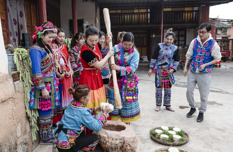 村民在迤沙拉村广场上打糍粑。石磊 摄