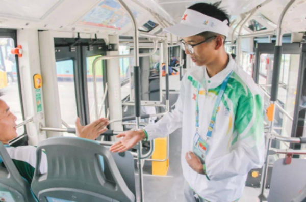 “This way,please.”(请往这边走)……13点25分,要在城北武术40站台搭乘大巴车的运动员缓缓走来,李邦辉迅速上前用手势指引他们上车,随后,他上车与司机确认车内人员数量后,挨个提醒运动员、代表团官员系好安全带。提醒过程中,一位运动员示意自己一直无法系好安全带,神情焦急。李邦辉一边用流利的英语安抚该运动员着急的情绪,一边协助他系好安全带。在发车前的2分钟,李邦辉再次与司机确认了车内人数,提醒运动员、代表团官员系好安全带,告知他们预计通行时间、到达场馆时间后,迈着轻快的步伐返回自己的座位。