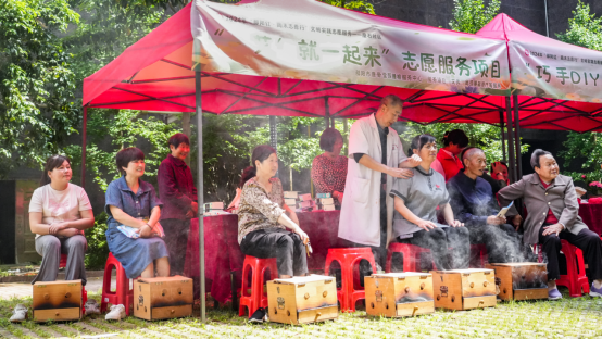 志愿者为社区居民开展艾灸理疗服务。