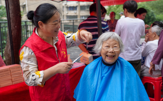 志愿者开展义剪服务,社区居民脸上洋溢着幸福的笑容。