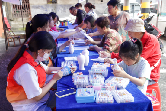 小朋友们在志愿者的带领下绘制主题陶瓶画丰富周末生活。