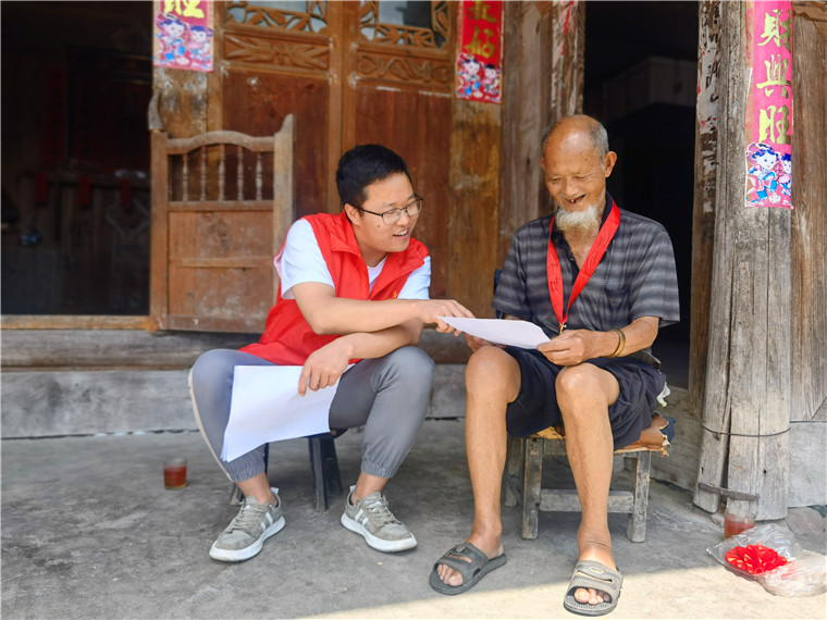 岑巩县平庄镇背鹅村志愿者向在党50周年的老党员宣传解读党的政策。杨波 摄