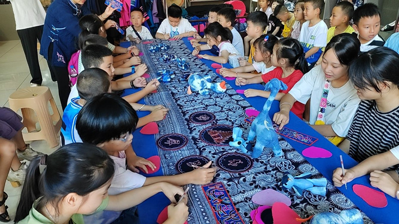 “老师,这个图案这样画对吗?”“老师,我这样绣图案应该没问题吧?”……在“文明实践 快乐暑假”非遗小课堂上,绣娘们手把手教授学生们侗绣技法。“侗族刺绣的针法、技巧对于孩子们有些复杂,孩子们第一次接触,我们就从简单的选线、构图等内容进行教学,这样也可以让孩子们在接触的过程中提高学习的兴趣。”侗族刺绣传承所负责人说。