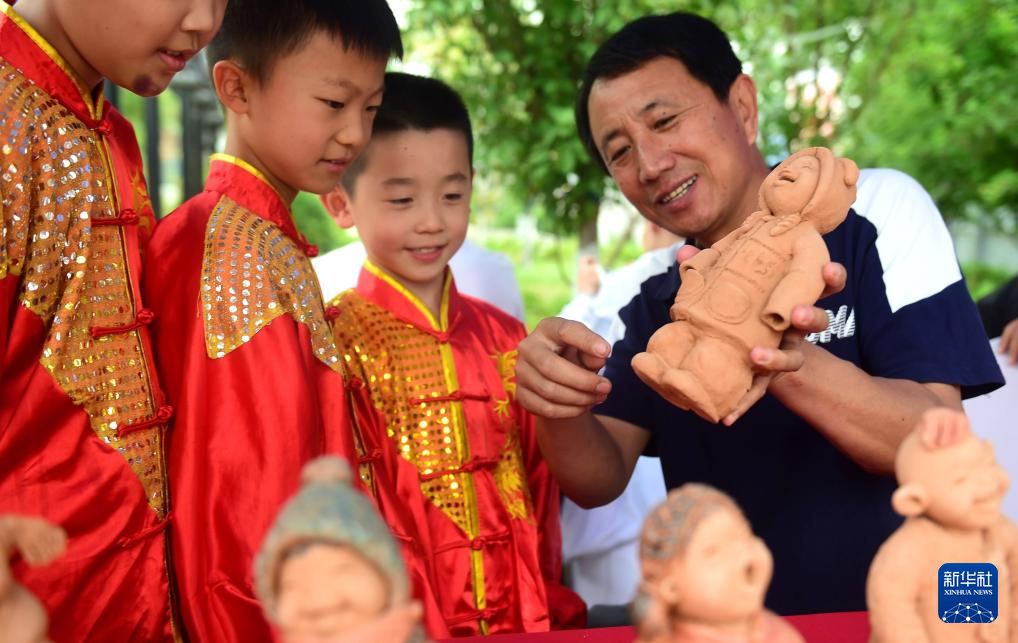 6月2日,来自沧州东光县的泥塑艺人向参观者介绍“观州泥塑”作品。 新华社发(傅新春摄)