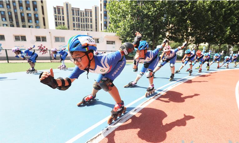 近日,唐山市丰润区迎宾路小学的学生在进行轮滑训练。