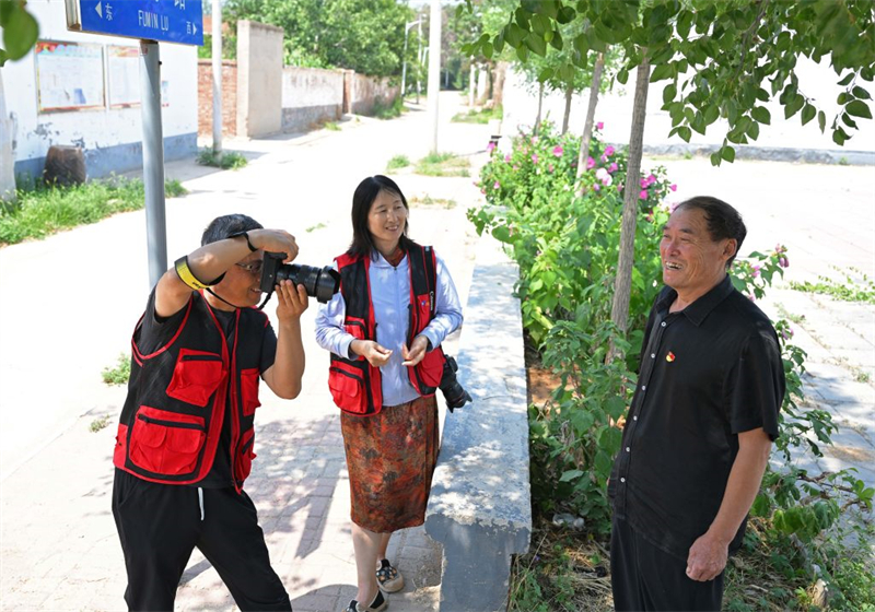 6月28日,临城县摄影家协会会员在为西渎村老党员李发应拍照。