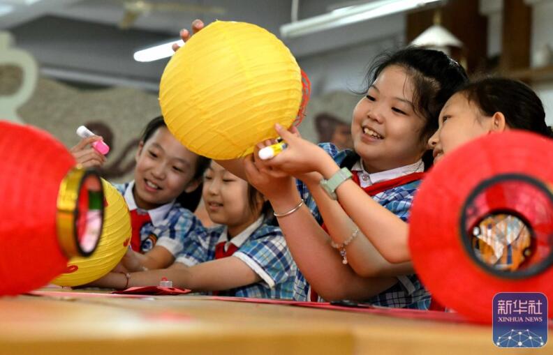 9月11日,在石家庄市桥西外国语小学迎中秋活动中,孩子们在制作花灯。新华社发(陈其保摄)