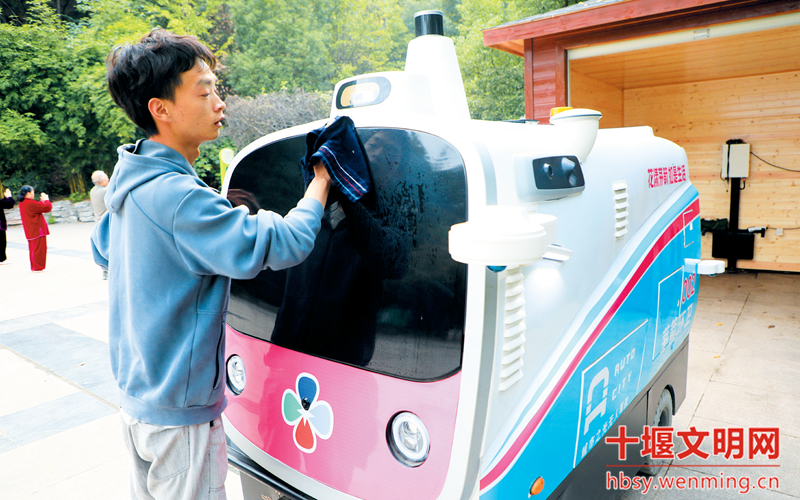 10月25日,茅箭区环卫所职工谈澳辉擦拭干净环卫机器人,准备让其上岗。