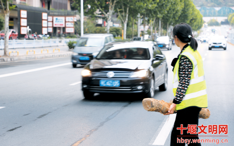10月24日,张湾区环卫所车队主管李明秀在发展大道巡查时,穿过车流将掉落在马路中央的木头抱回人行道,消除交通安全隐患。