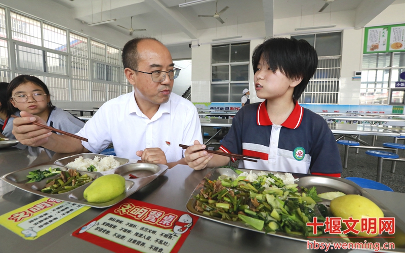 6月25日中午,竹山县宝丰镇宝丰中学的食堂里,学生们陆续来到宽敞明亮的餐厅里就餐。该校校长也来到学生们中间,陪餐并了解食堂饭菜质量。