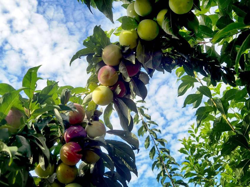 走进耀妙家庭农场李子园,满园的果子挂满枝头,在蓝天白云下恰似一幅“丰”景图画。