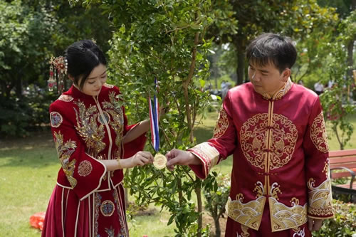 珠帘绣幕蔼祥烟,合卺嘉盟缔百年。5月21日上午,荥阳21对新人在中原棋遇记参加了一场主题为“棋遇荥阳 缘定今生”的中式集体婚礼,并在荥阳植物园种下象征着婚姻美满、幸福的石榴树。